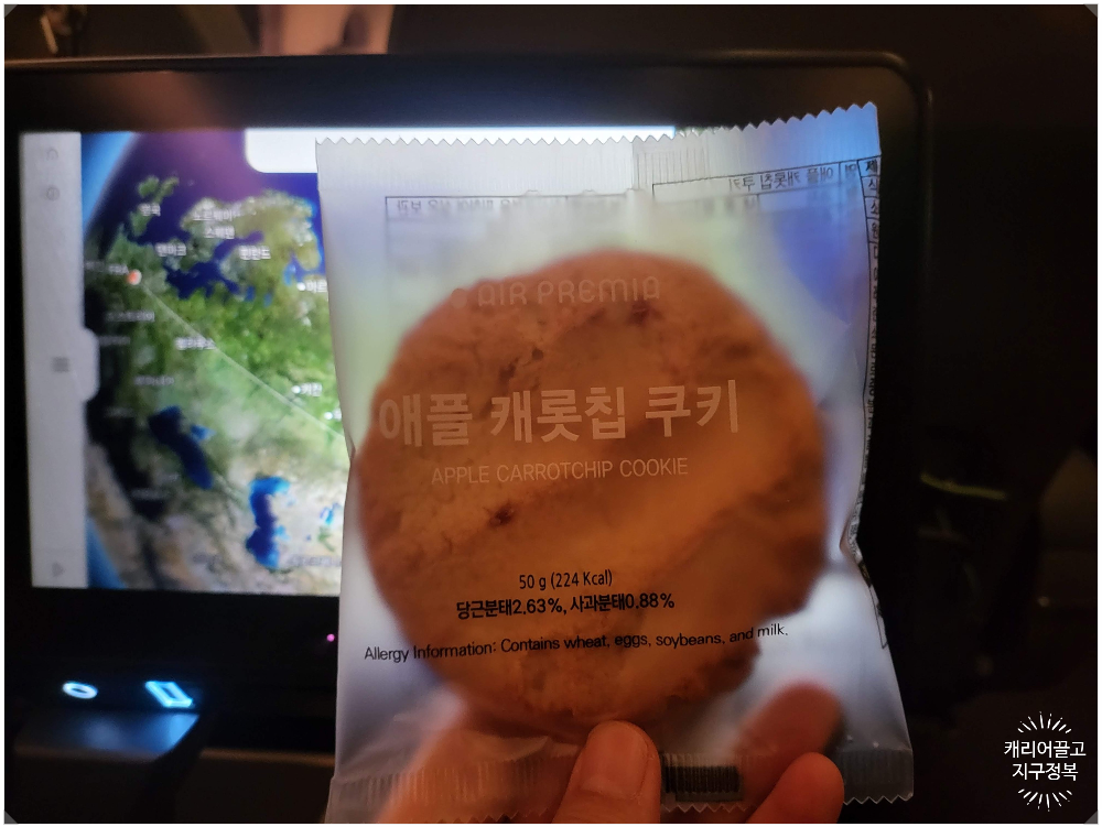 기내식은 두 번 나왔고, 중간에 간식으로 손바닥만 한 쿠키가 나왔습니다.