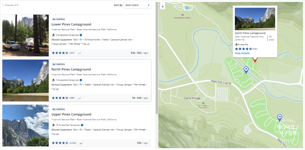 요세미티 내 예약이 가능한 상품들이 나타납니다.