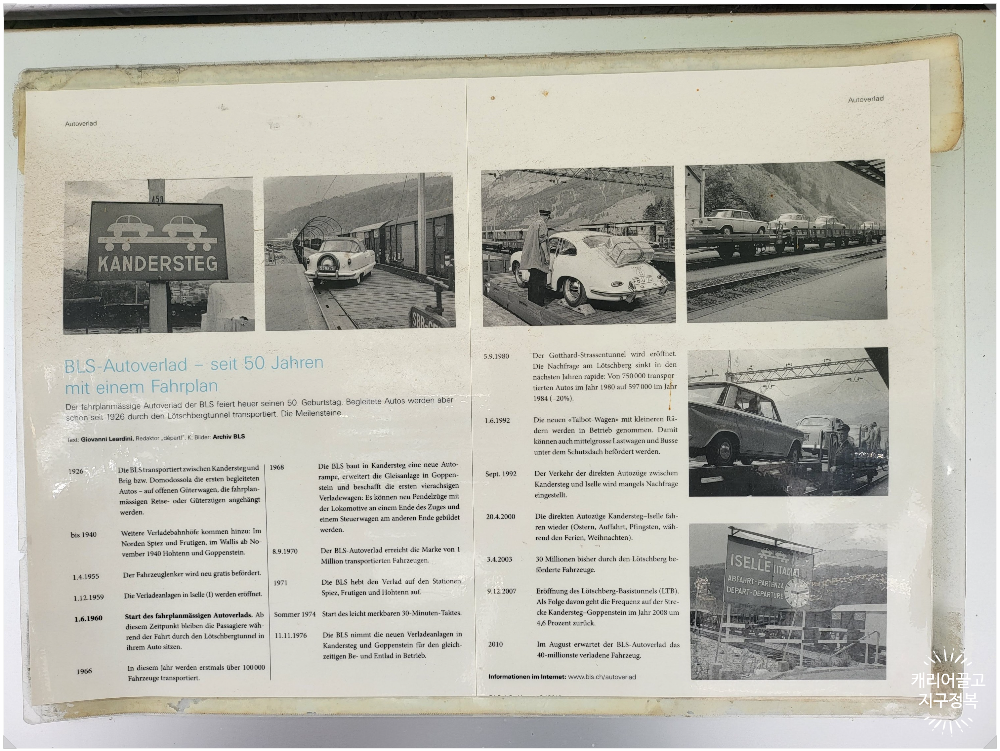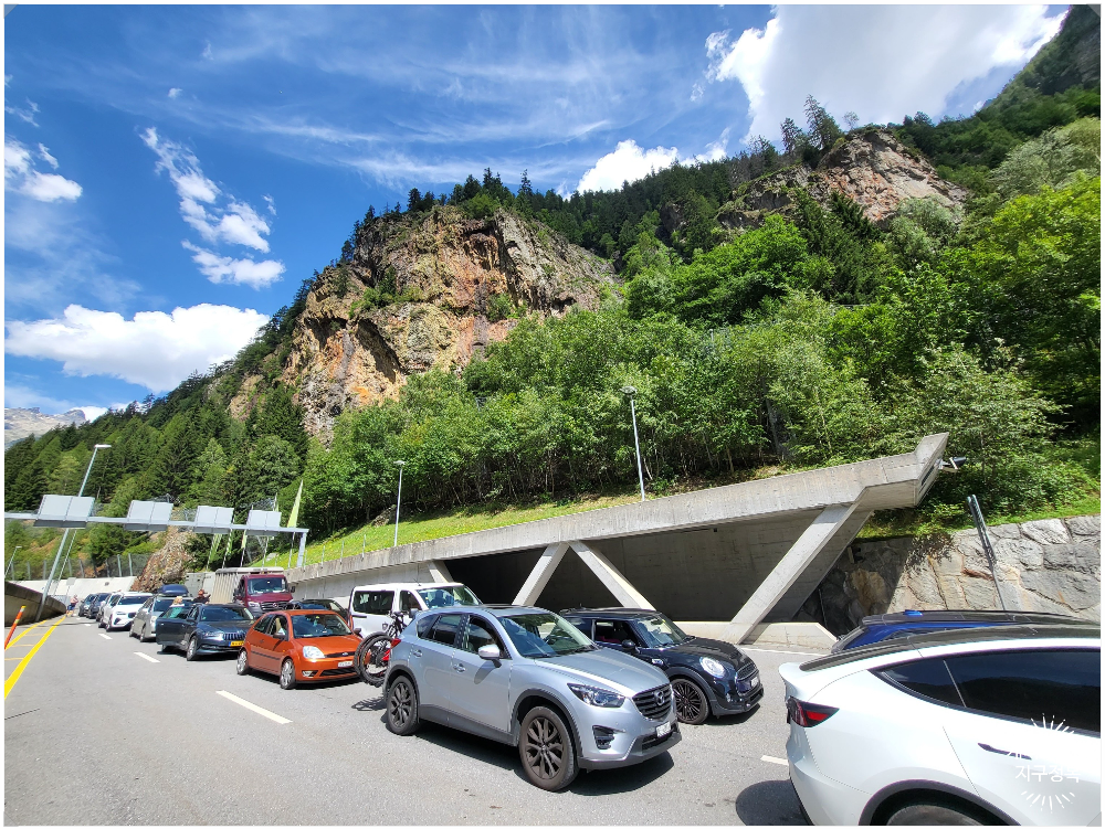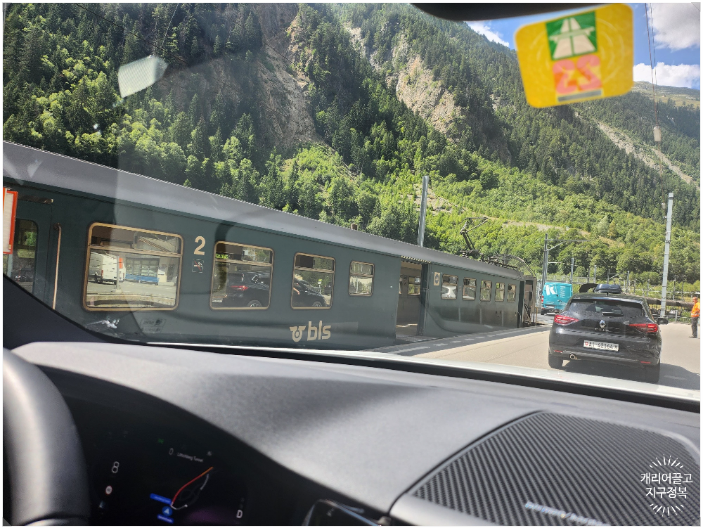 체르마트에서 인터라켄으로 렌터카를 타고 가려면, 자동차를 실어가는 기차를 타야 합니다. 그렇지 않으면 두 시간을 넘게 돌아가야 하거든요. 이 기차는 알프스 산을 터널로 통과하는 기차이기 때문에 빠르게 갈 수 있습니다.