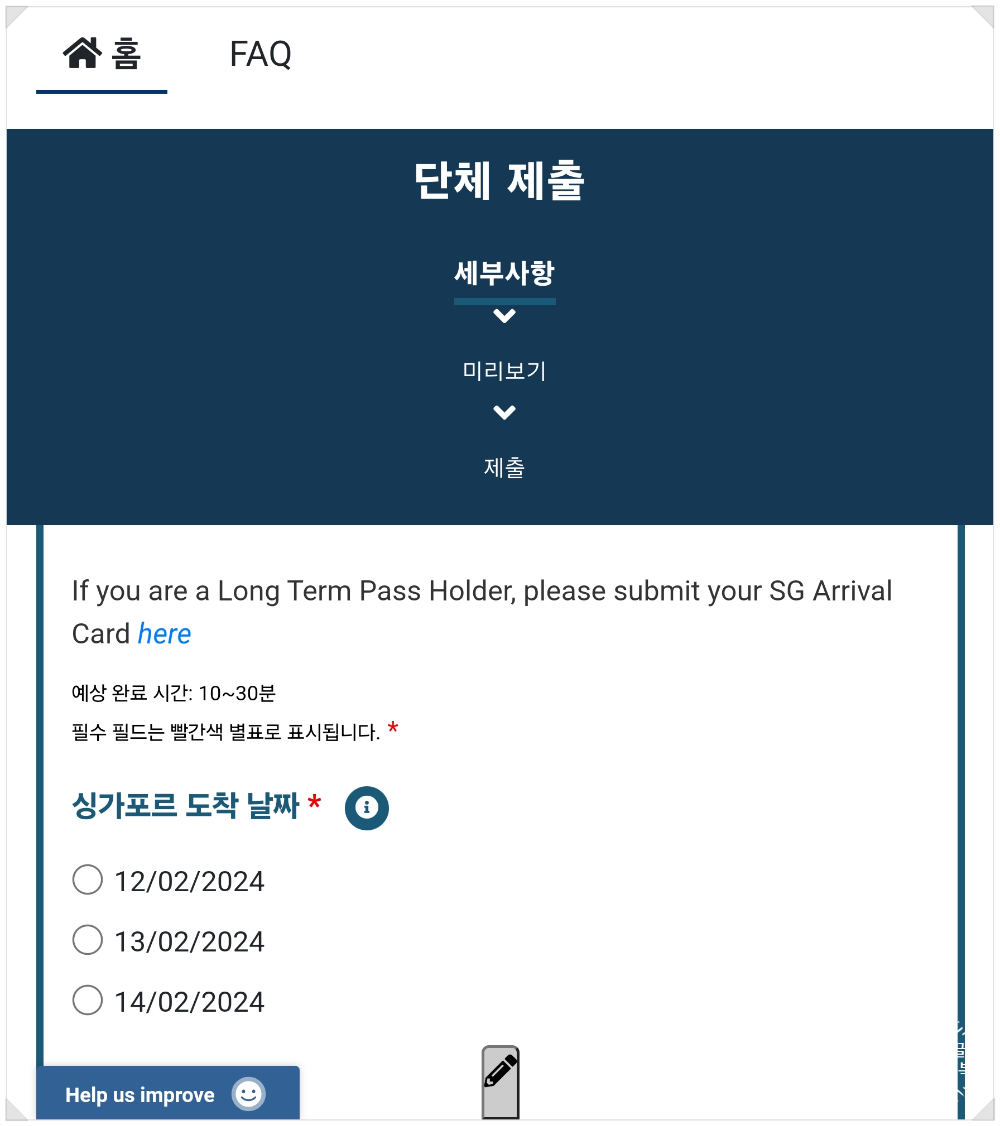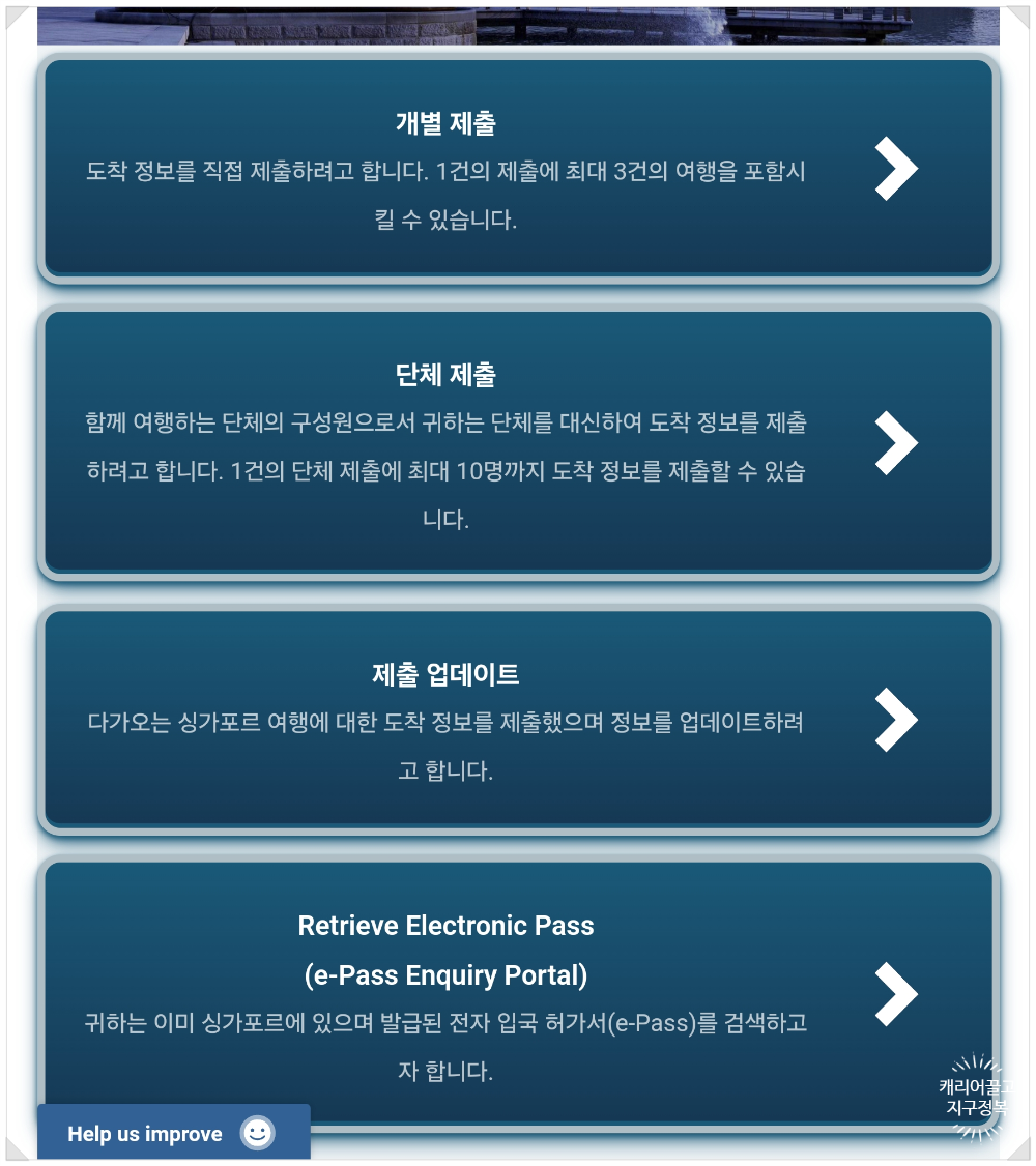 싱가포르에 입국할 때, 입국심사를 받기 전에 입국카드(Arrival Card)를 작성해야 합니다. 종이에 작성하는 것이 아니라 웹페이지에서만 작성이 가능합니다. 개인, 단체 등 유형에 따라 작성이 가능한데, 작성 후에 입국비자가 email로 날아옵니다. 그래서, 여러 명의 입국심사카드를 작성한다면 꼭 개별 email을 작성해 주시는 것이 좋습니다. 똑같은 email을 넣으면, 그 email로 비자가 몰려오기 때문입니다.