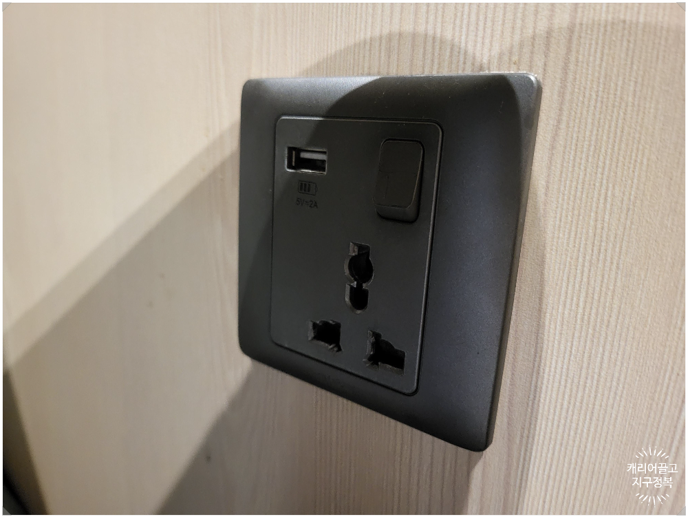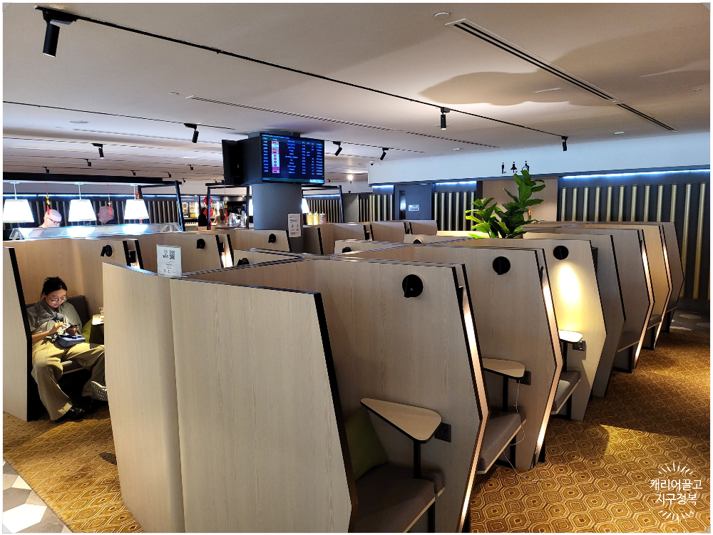 여기 라운지의 개인 좌석 아래에는 전기 아웃렛이 충분히 있습니다.
