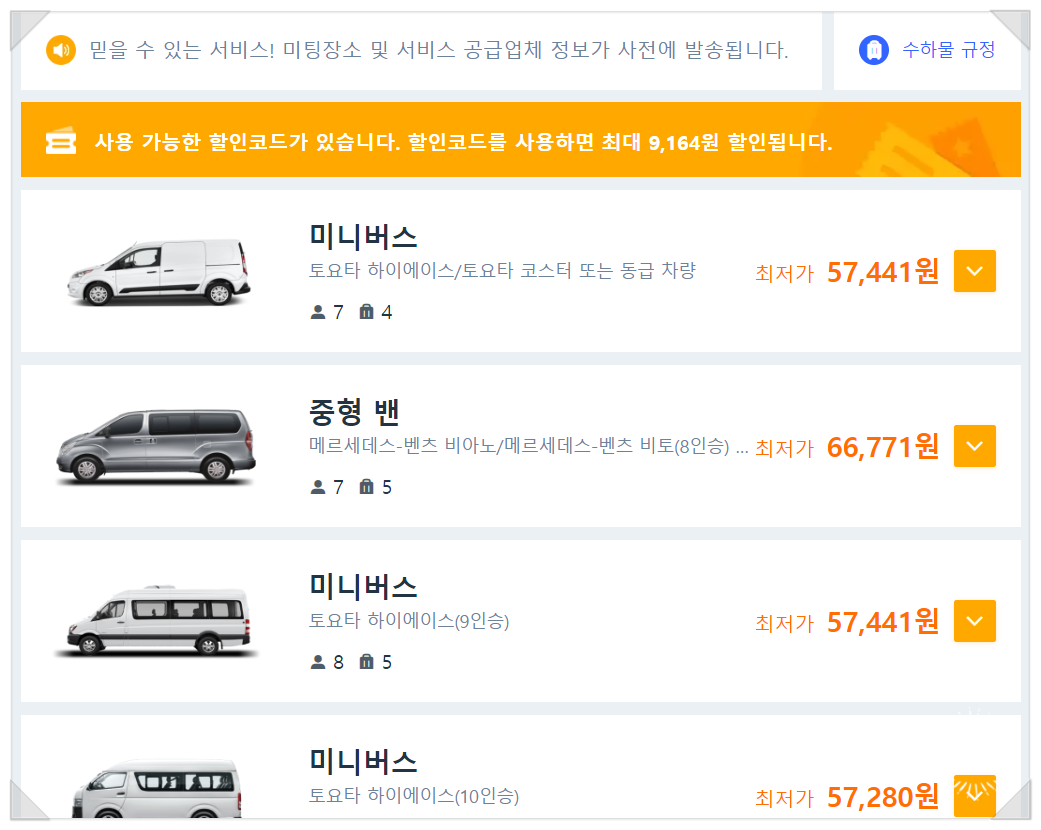 이렇게 입력하고 나면, 아래와 같이 픽업이 가능한 차량이 나옵니다.
