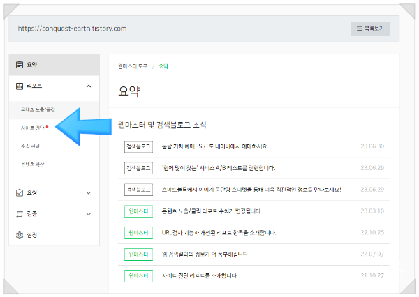 사이트 진단부터, 수집현황 등을 쭈욱 보시면 됩니다.
