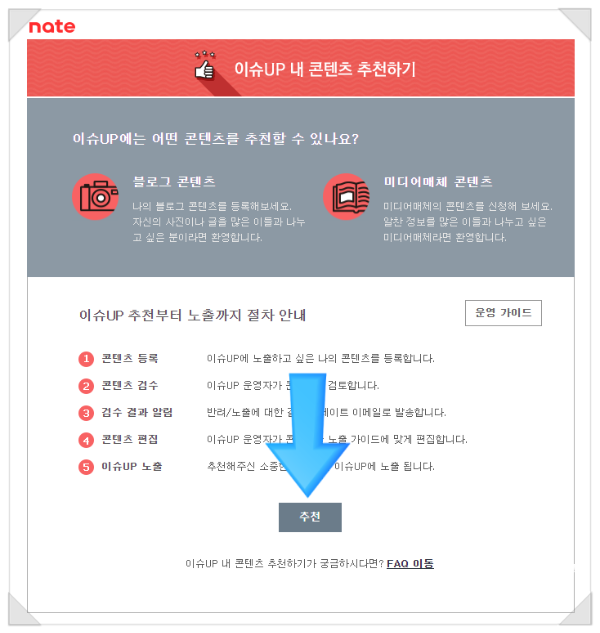 이슈UP 추천부터 노출까지 절차 안내 운영 가이드 콘텐츠 등록 이슈UP에 노출하고 싶은 나의 콘텐츠를 등록합니다. 콘텐츠 검수 이슈UP 운영자가 콘텐츠를 검토합니다. 검수 결과 알림 반려/노출