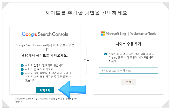 이 그림처럼, 구글 서치 콘솔에 등록된 본인의 블로그 정보를 "가져오기" 누르시면 됩니다.