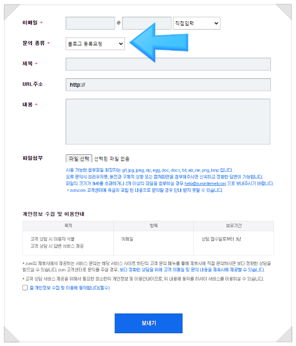 개인정보 수집 및 이용안내 목적 항목 보유기간 고객 상담 시 이용자 식별 고객 상담 시 답변 서비스 제공 이메일 상담 접수일로부터 3년 * zum의 제휴사에서 제공하는 서비스 문의는 해당 서비스