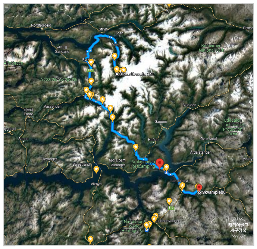 더보기 5번 도로를 타서 송네 피오르를 건너가야 오늘 숙박장소에 도착할 수 있습니다. 그 경로상에는 키외스네스 피오르를 볼 수 있는 장소와, 또 다른 빙하 뷰 포인트인 보야브린 빙하를 볼 수 있는 곳, 그리고 빙하 박물관이 있습니다. 안녕하세요, 캐끌지정입니다. 유럽에서 가장 큰 빙하인 요스테달스브린(Jostedalsbreen) 빙하는 잘 구경했습니다. 엄청나게 큰 빙하라고 하는데, 실제 캐끌지정 가족이 본 브릭스달 빙하는 요스테달스브린 빙하의 끄트머리 조금뿐이었습니다. 아무튼, 벌써 6시가 넘은 저녁시간이 되어서 얼른 이동을 해야 합니다. 트롤스티겐을 떠났을 때부터 목적지인 베르겐까지는 갈 수 없는 거리이기 때문에 중간 적당한 지역에서 2박을 하고 갈 예정이었답니다. 이제 슬슬 숙박장소를 찾아야 합니다..