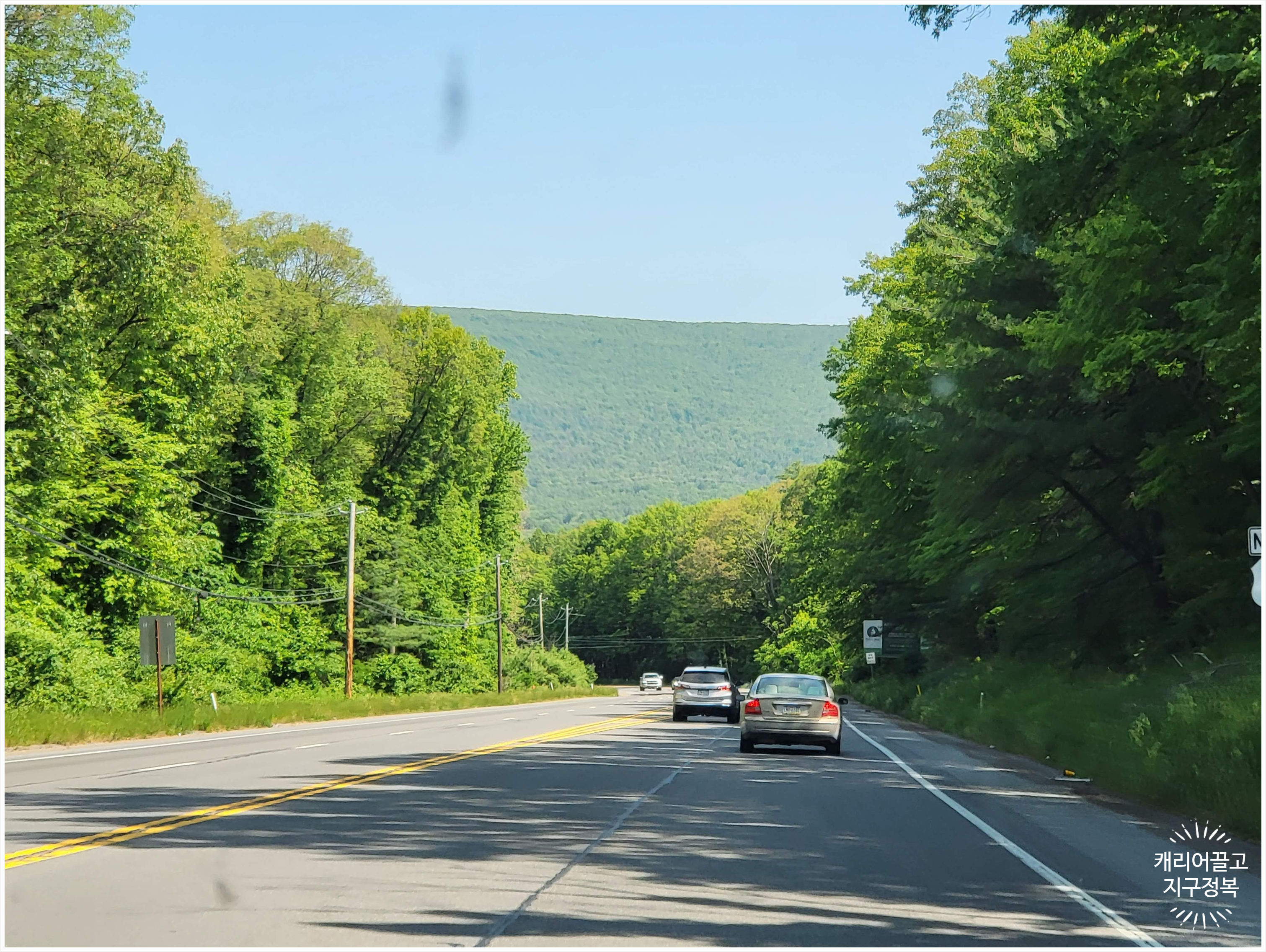 안녕하세요, 캐끌지정입니다. 미국 렌터카 여행을 준비하는 분이면 도로 사정이 어떤지 궁금하실 겁니다. 제가 작년 여름에 서부, 올해 동부를 다녀보니, 동부는 고속도로에서 운전하는 재미가 정말 없습니다. 서부는 사막이고 산이 없어서, 정말 넓은 지역을 눈으로 보는 재미라도 있었는데, 동부는 숲이 많아서 보이는 게 거의 없습니다. 어쩌다 높은 지역에 가면 넓은 숲이 보이는 정도입니다. 저 멀리 보이는 것은 바다가 아닙니다. 숲입니다. 끝없이 숲만 있습니다. 도로의 좌우도 숲입니다. 그냥 숲만 있습니다. 지역 이름이 burg 인 곳은 이렇게 약간 높은 지역입니다. 이런 곳도 잠시이고, 조금만 지나면 다시 숲입니다. 사진으로 찍지는 않았지만, 숲에서 나온 많은 동물들이 로드킬을 당합니다. 제가 운전하면서 본 사..